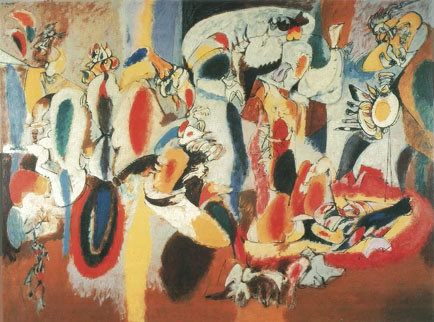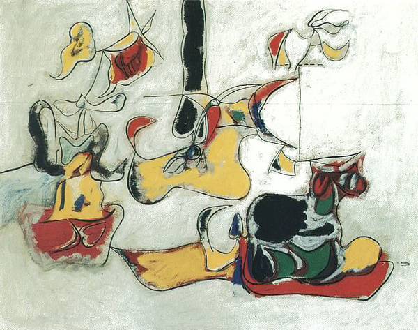 再來看戈爾基受到米羅與康定斯基影響的「肝是公雞的冠 The Liver is Cock’s Comb ,1944」畫作也相同,只不過這件作品又多了些俄國風,這種繪圖風格通常會加入一些由黑線所勾勒的細節素描,局部再以高明度的色彩著色。「肝是公雞的冠」以洋紅米黃土黃為組色,畫出許多交纏而連續的造形,有些看似水果蘋果杏桃有些又像似陽具與陰戶,彼此黏賴相依無法分離。戈爾基用短筆觸為造形填上羽化邊界的色彩,讓色彩刺激視網膜的感知成為光輝耀眼的特效,這些迷亂、敏感又躁鬱的造形,任意地透露狂野的情慾意念,藉著張牙舞爪的姿態來掩飾內心的焦慮與恐懼。