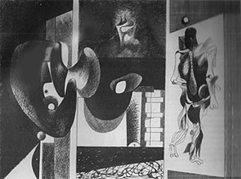 短筆觸的練習過程中,戈爾基也受到奇里柯的影響,這件作品被命名為「夜晚、謎與鄉愁Nighttime, Enigma and Nostalgia」,以抽象造形取代奇里柯常用的靜物,三組造形分屬近、中、遠景的空間結構,透過線條表現層次的空間,畫面中心似人的造形扮演著背後靈般的角色,操控神秘的無形力量,宰制宿命人生。