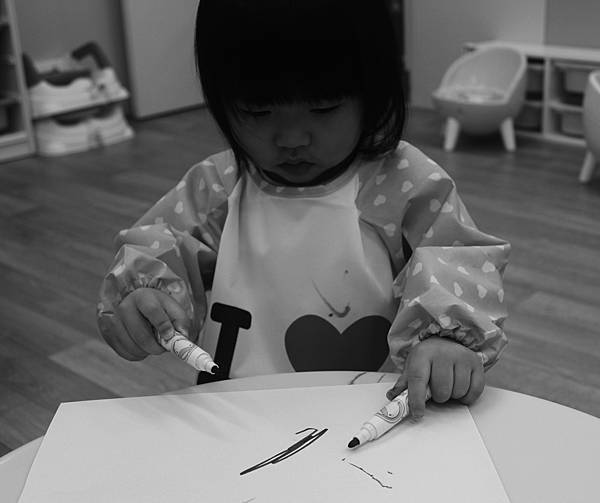 開始嬰兒塗鴉由父母提共筆,補充紙張,在塗鴉的桌面只留下兩枝筆和一張紙。(關於紙筆,請參考嬰兒塗鴉材料的選擇一文)