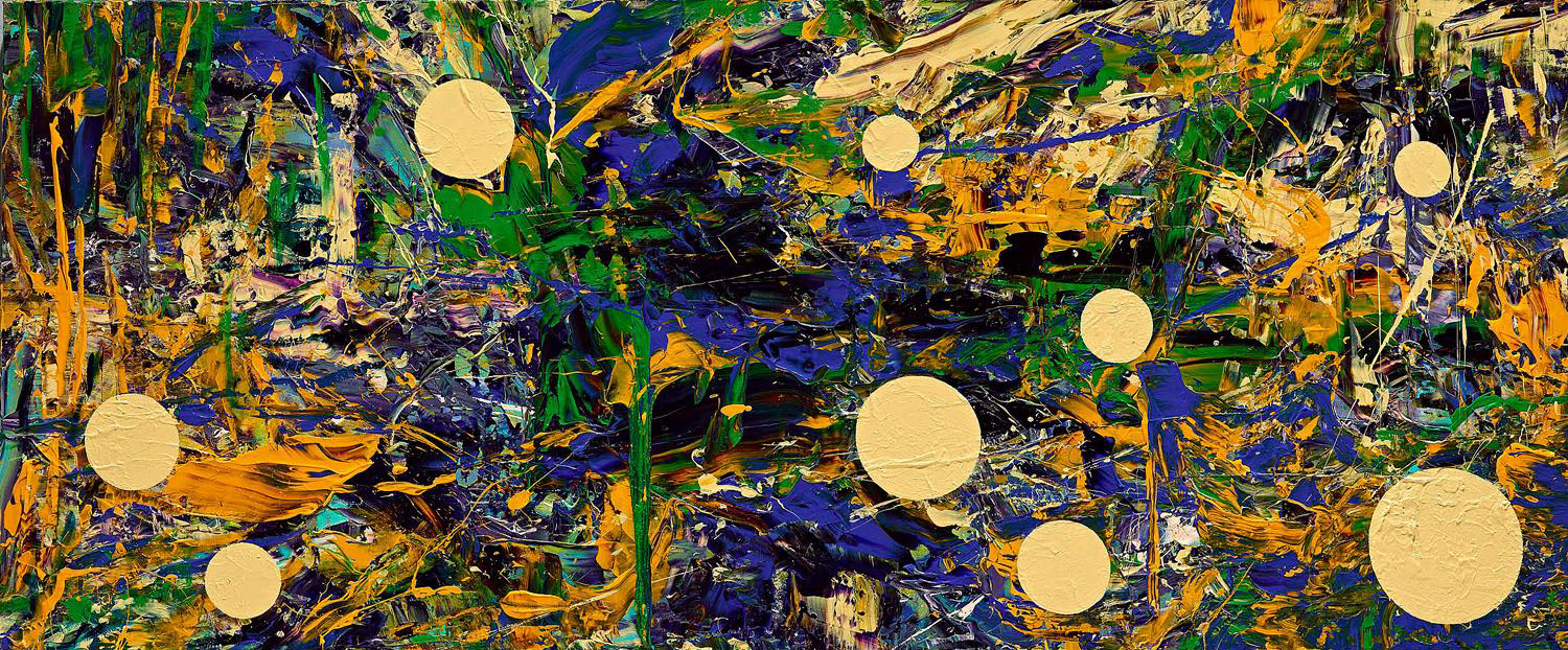 在一眼望去之際,我先看到了的圓,然後再看到背景那些不可調解與理論的筆觸,深深感覺到兩種元素是藝術家在經歷病痛手術之後的內在治療,特別是那些後來加入畫面中的圓,無需轉折/轉角,沒有起點與終止的順勢、包容的幾何形,帶著光點的質地,扮演著祈願生命圓滿無缺的希望符號。